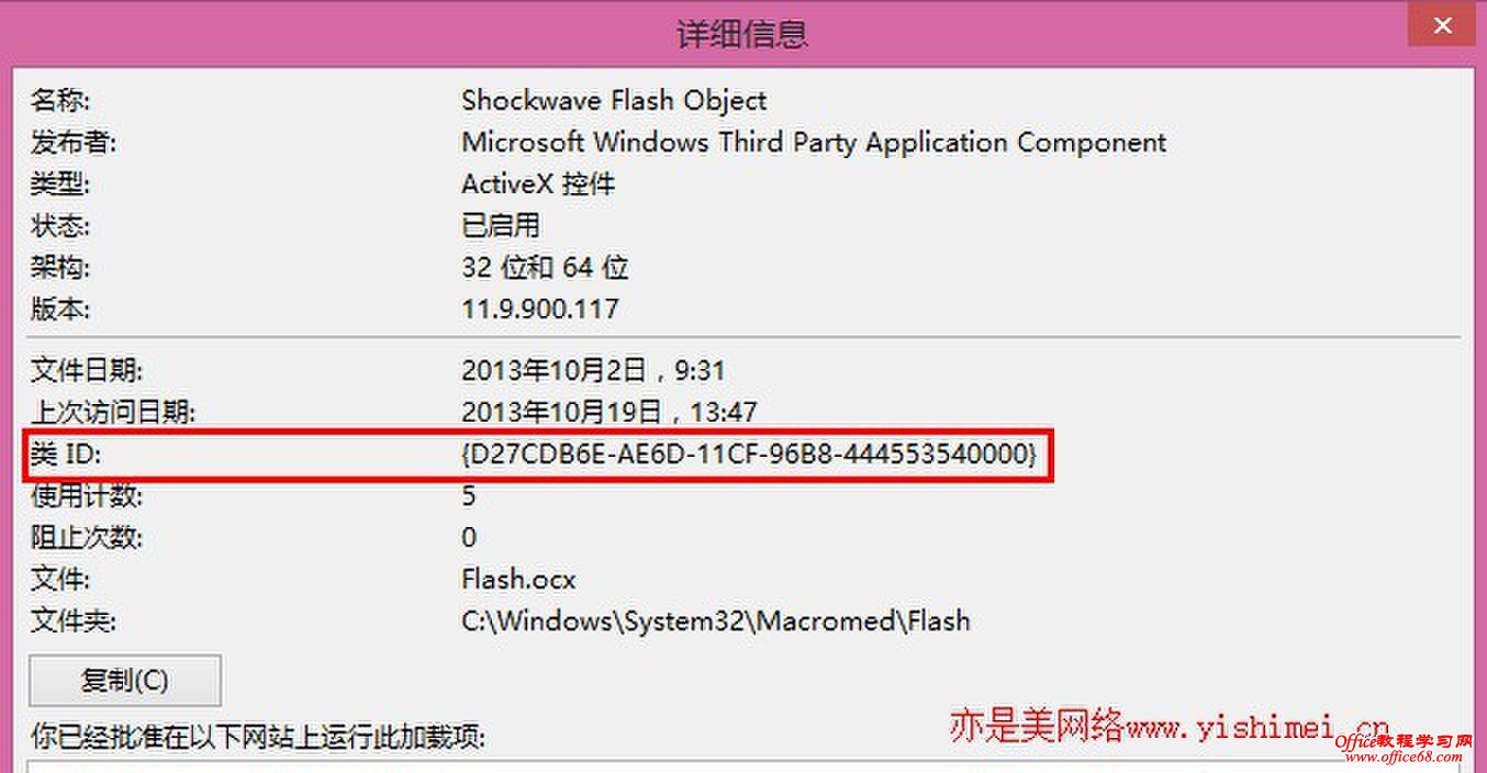 如上图所示,依次找到工具 -启动 - Internet Explorer,这里会列出IE中的所有加载项,如果确定要删除,直接选中要删除的项,点击右边的“删除条目”就可以了。 下面我们说说第2个解决办法,使用删除注册表来清理IE中的加载项,首先打开运行(win + R),输入regedit调出注册表窗口,选中HKEY_CLASSES_ROOT,依次展开Wow6432Node - CLSID,其中列出的部分就是IE加载项中的内容,然后我们打开IE加载项(工具 - 管理加载项),选中要删除的管理加载项,右键 - 详细信息,找到“类ID”,如下图所示: