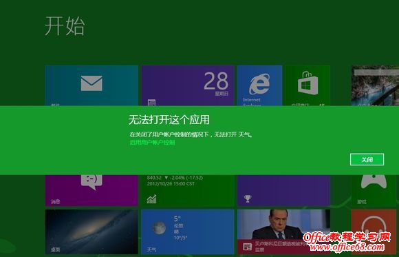 有些同学在装过win8.1并激活后,当打开磁贴里也就是windows开始菜单中的项目时,会出现“在关闭了用户帐户控制的情况下,无法打开XXXXXX"的情况,当然了,并不是所有的同学都会遇到这个问题,只有在使用内置管理员用户的情况才会出现这个问题,今天在帮一个同学激活win8.1后,他随即向我提出了这个问题,于是亦是美网络就打算为他写一个解决教程出来,顺便帮助更多的同学。 在开始之前,先给大家上一张图片,如下图所示,无论是打开天气、应用商店、咨询等应用程序,都会出现图中显示的错误,