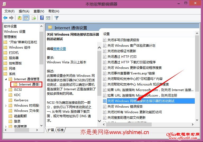 我们右键开始菜单 - 运行,输入gpedit.msc回车,之后就会弹出组策略的窗口,我们一次找到“计算机配置”-“管理模板”-“系统”-“Internet 通信管理”,然后单击选中“Internet 通信设置”,在右边的窗口中找到“关闭 Windows 网络连接状态指示器活动测试”,如下图所示: