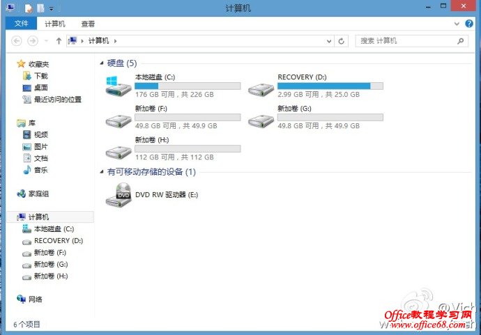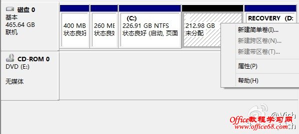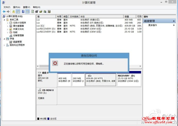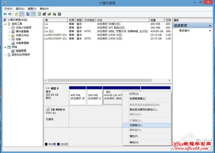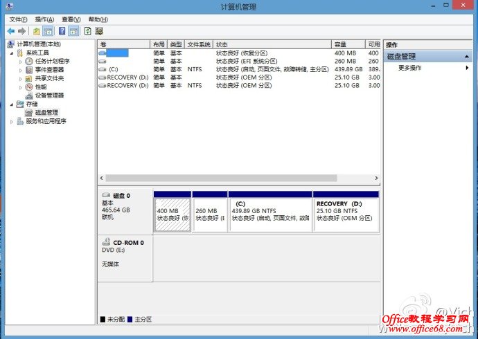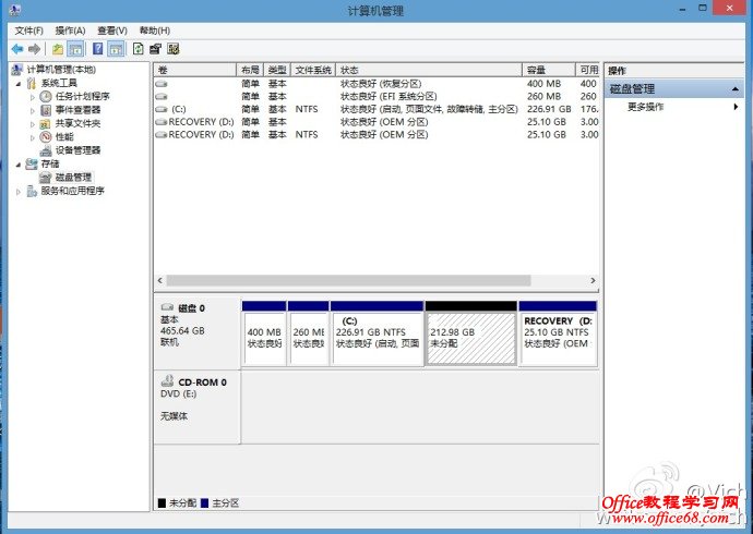首先来看预装window8系统的磁盘分区,一般是一个系统盘和一个系统恢复盘。我们需要把C盘减小,然后腾出空间做为其他分区。