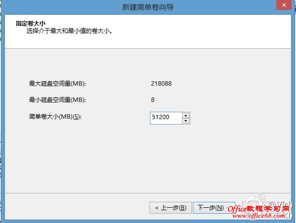 在未分配磁盘空间上,右击操作,选择“新建简单卷”,按照向导提示进行分区。(图中为示范建立一个50G=51200M的分区)