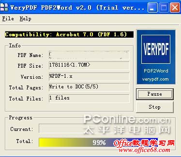 PDF(Portable Document Format)文件格式是Adobe公司所开发的一种特殊的文本格式,这种文本格式最大的优点是其尺寸较小、阅读方便,非常适合在网络上传播和使用。现在,很多产品的说明书都使用PDF格式,例如电子书籍、产品白皮书,包括很多产品的技术资料都是PDF格式。但是如果想要对其进行文本或格式进行编辑一类的操作就会比较困难,因为PDF格式与Doc格式解码格式不同,在PDF下的回车符、换行符以及相关的图片格式无法直接转换为Doc文件,本期我们就来介绍几种将PDF格式文件转换为常用的DOC(Microsoft Word格式)格式文件的方法。 使用Office2003自带的工具转换 首先使用Adobe Reader打开待转换的PDF文件,接下来选择“文件→打印”菜单,在打开的“打印”设置窗口中将“打印机”栏中的“名称”设置为“Microsoft Office Document Image Writer”,确认后将该PDF文件输出为MDI格式的虚拟打印文件。 如果在“名称”设置的下拉列表中没有找到“Microsoft Office Document Image Writer”项,那证明你在安装Office 2003的时候没有安装该组件,请使用Office 2003安装光盘中的“添加/删除组件”更新安装该组件。 运行 Microsoft Office Document Imaging,并利用它来打开刚才保存的MDI文件,选择“工具→将文本发送到Word”菜单,并在弹出的窗口中勾选“在输出时保持图片版式不变”,确认后系统提示“必须在执行此操作前重新运行OCR。这可能需要一些时间”,不管它,确认即可。 小提示:Microsoft Office Document Imaging对PDF转DOC的识别率不是特别完美,转换后会丢失原来的排版格式,所以转换后还需要手工对其进行排版和校对工作。 ScanSoft PDF Converter for Microsoft Word ScanSoft PDF Converter for Microsoft Word是由ScanSoft公司和微软共同组队开发的一个Word的插件,它可以让你在没有Adobe Acrobat的情况下将PDF文档转化为Word文档,并且完全保留原来的格式和版面设计。