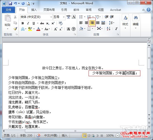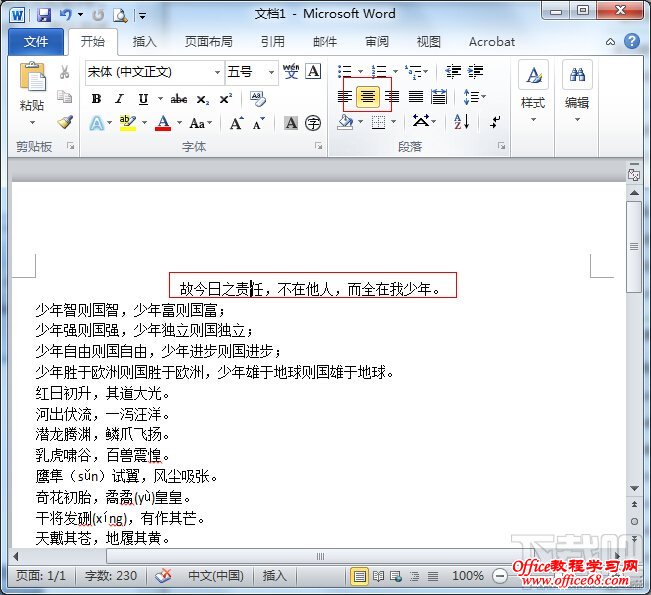此时,文本将水平对齐到文档的中间位置,查看设置效果。