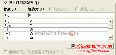 首先,打开菜单"工具→自动更正",在"自动更正"选项卡中选中"键入时自动替换"。下面有一些自带的自动更正项目,也可以由"替换"和"替换为"进行添加,然后就可以使用了。如:要输入Intel®,可以在输入Intel后紧接着输入英文状态下的"(r)"(不含引号)。再如:要输入Windows™、Lg©,同样输入英文状态下的"(tm)"、"(c)"即可。需要说明两点:实现上述自动更正的前提是先将其添加到自动替换列表中(如图);如果不想执行"自动更正",按一下退格键即可。