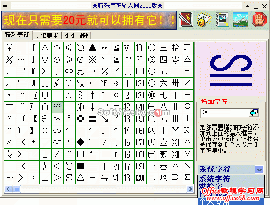 利用软件"特殊字符输入器",该软件使用非常简单,可以方便的输入特殊字符(如图),只要在软件中选中需要的字符,软件就自动将该字符拷贝入系统"剪贴板",在你需要插入字符处用"粘贴"(Ctrl+V)命令就可以了。另外对于常用的字符,我们可以通过其"增加字符"功能,将其加入"个人专用"中,以方便使用。