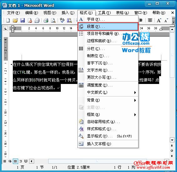 1 打开Word文档单击菜单栏“格式”→“段落”。