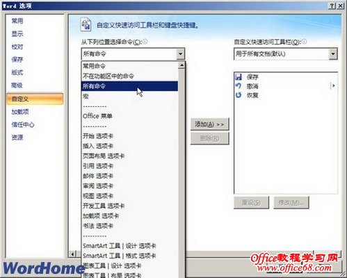 2 在打开的“Word选项”对话框中单击“自定义”按钮,然后在右侧“自定义快速访问工具栏和键盘快捷键”选项卡的“从下列位置选择命令”下拉菜单中选择“所有命令”选项。