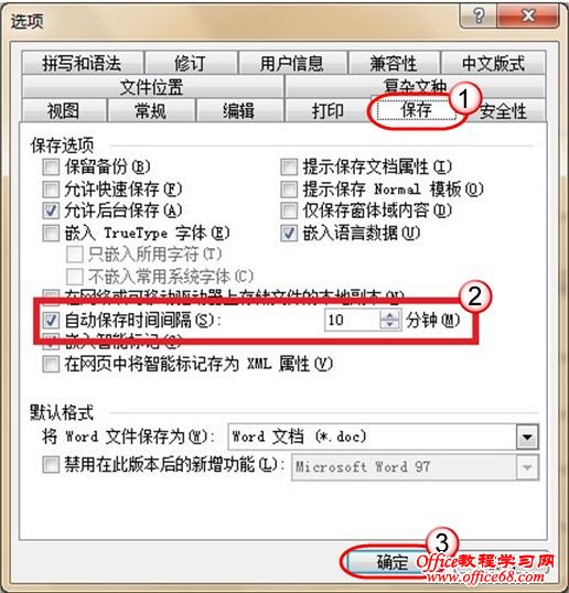 ◆小提示:以上是Word 2003版的设置情况。在Word 2007中设置自动保存文档的方法有所不同。具体方法是,单击“Office”按钮,在弹出的下拉菜单中单击“Word选项”按钮,在弹出的“Word选项”对话框中切换到“保存”选项卡,然后在“保存自动恢复信息时间间隔”复选框右侧的微调框内设置自动保存的时间间隔。 |