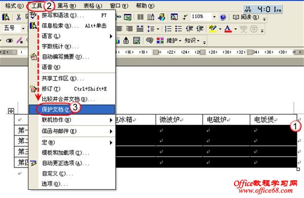 在Excel中可用只允许修改指定区域,达到保护Excel工作表的目的。那么在Word中能否实现只允许修改指定的区域呢?笔者经过研究,找到一种切实可行的办法,只能让修改者在指定的区域操作,而不能动文档的其他部分,从而达到保护Word文档的作用。除了修改者不能往文档中输入无用内容外,连删除已有文档内容都不可以。 我以一个简单的统计表为例,这个Word表格是用来统计4个季度的电器销量,用户只能在指定空白处填写,不允许改变这张表格的样式和表头项目内容,也不允许删除表头内容。具体实现步骤如下。 第一步:选择只允许别人修改的区域,单击菜单栏上的“工具→保护文档”命令。(图1)