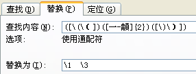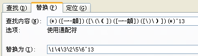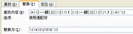 2.括号内是两个字的成语进行交换。在“查找内容”栏中输入“(*)([一-龥]{2})([\(\(])([一-龥]{2})([\)\)])(*)^13”(通配符[一-龥]{2}表示任意两个中文汉字),其他设置与上步相同,单击“全部替换”按钮,将括号中的两个错别字与括号前的两个汉字进行交换(见图5)。