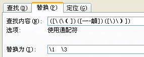 3.清除括号内是一个字成语中正确的内容。形如“哀(  )声叹气”。在“查找内容”栏中输入“([\(\(])([一-龥])([\)\)])”)(查找“以全角或半角小括号括起来,并且中间是一个汉字”的内容),在“替换为”栏中输入“\1  \3”(中间有两个空格)。单击“全部替换”按钮,将括号中的单个错别字用空格替换(见图6)。