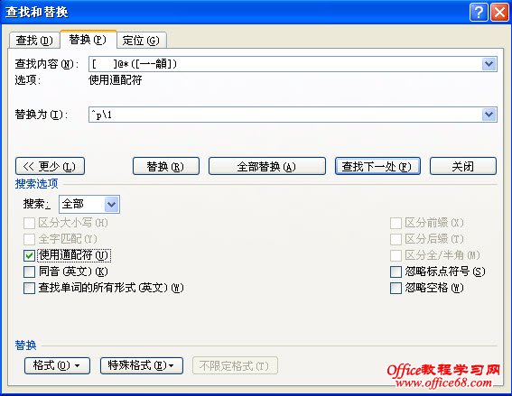 操作方法:光标定位在文章开头处,按快捷键“CTRL+H”调出“查找与替换”设置框,单击“替换”选项卡,在“查找内容”栏中输入“[  ]@*([一-龥])”(不含引号,下同。其中通配符[  ]表示全角或半角空格,@表示1个以上前一字符或表达式,*表示任意字符串,[一-龥]表示任意单个中文汉字,()表示表达式分组,\1表示第一个表达式。整体表示查找“以全角或半角空格开始,后面跟随若干空格或任意字符串,直到遇到第一个汉字为止”的内容)。接下来在“替换为”栏中输入“^p\1”(将查找到除汉字部分以外的内容都替换为段落标记)。点选“搜索”选项后“全部”,勾选“使用通配符”复选框,单击“全部替换”按钮(见图3)。