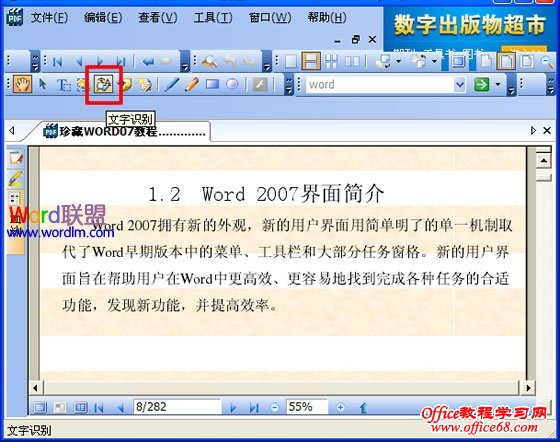 ①首先,打开CAJ文件,点击工具栏上面的“文字识别”(如下图红色区域所示);