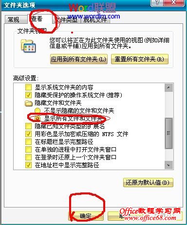 在弹出的“文件夹选项”中选择“查看”,然后在“高级设置”中勾选“显示所有文件和文件夹”确定即可。