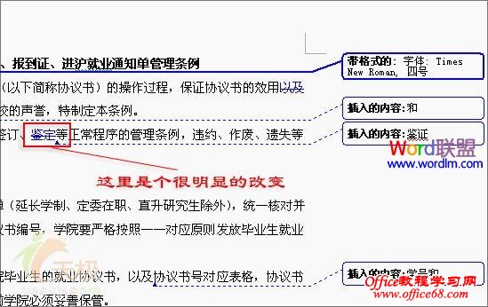 此时Word便开始新建一份文档,并将所有的不同点用蓝颜色醒目地标识出来。