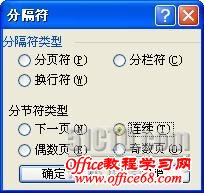 ![]() 2.2 点 插入 —> 分隔符 —> 连续 —> 确定 ,如图: