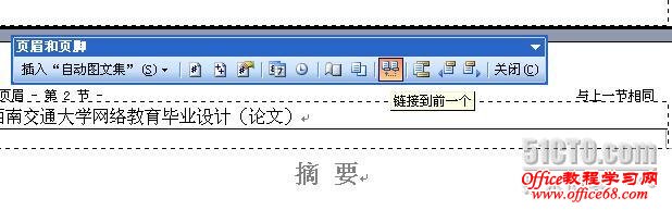 ![]() 2.3 双击正文第一页的页眉,在弹出来的页眉和页脚的对话框中点快捷图标“链接到前一个” ,然后再点关闭。如图: