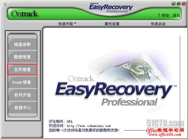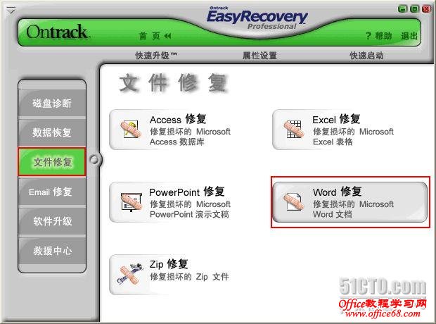 ![]() 上图为EasyRecovery的主界面,黑色方框区域为工具模块,红色方框为我们要用到的一个模块,可以修复office系列文档和zip文档。
