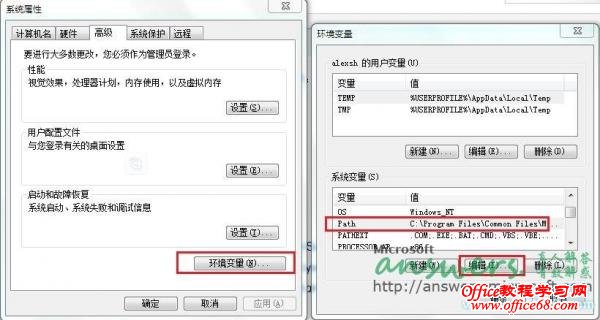 在弹出的系统属性选项卡中,点击“环境变量”,在下半部分的“系统变量”中找到Path,选中后点击Edit。