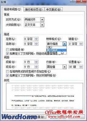 2 在打开的“段落”对话框中切换到“缩进和间距”选项卡,在“缩进”区域调整“左侧”或“右侧”编辑框设置缩进值。然后单击“特殊格式”下拉三角按钮,在下拉列表中选中“首行缩进”或“悬挂缩进”选项,并设置缩进值(通常情况下设置缩进值为2)。设置完毕单击“确定”按钮。