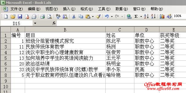 1、创建电子表格,因为我的电子表格是从长阳教育网下载的结果公示,已包含了获奖者的姓名、论文题目以及获奖等次等信息,因为要调用,标题以及不规范的非获奖记录行都要删除整理一下如图所示。