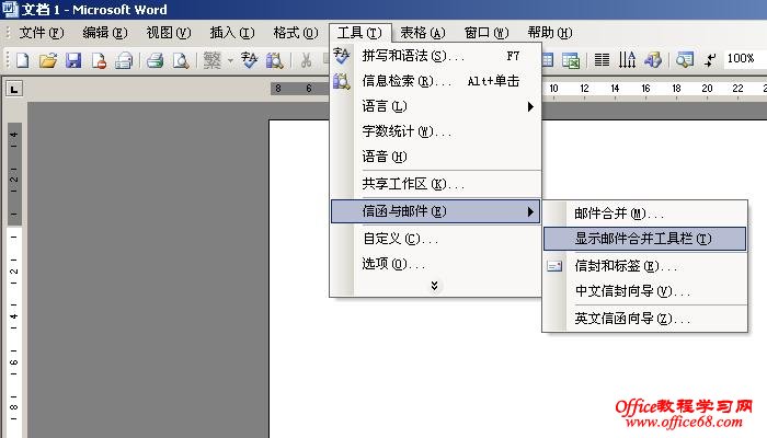 2、打开WORD2003文字处理软件(2000版可能有所不一样),在“工具”菜单中选择----“信函与邮件”菜单----“邮件合并”