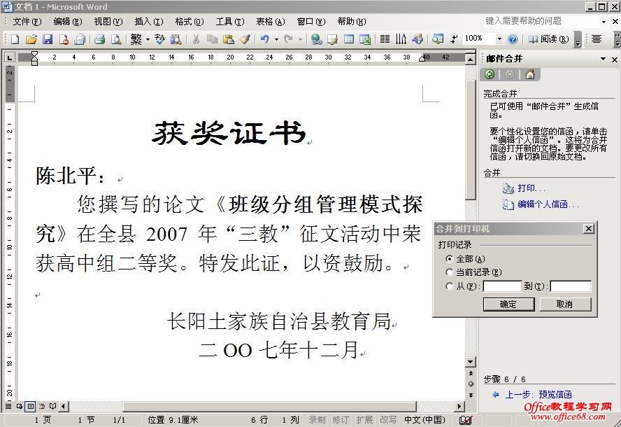 因为证书不是标准的A4大小,在纸张设置上进一步调整,有的证书上面有固定文字的,还要进一步设计填空的位置和大小。等一张做成熟之后,点击“完成合并”这时直接打印WORD还是只能打印一份的,如果全顺次打印出来,还要点选右边的合并项中“打印...”或者“编辑个人信件”前面是直接合并到打印机,一个一个打印出来,如上图,后面一个是把电子表格中的所有记录生成一个WORD文件,可以生成后在WORD中按常规方法打印。