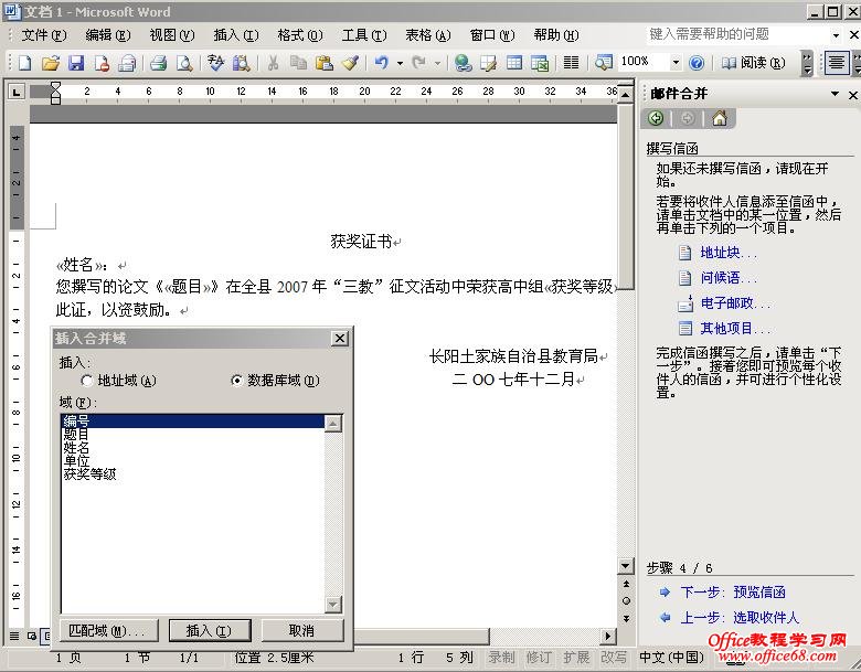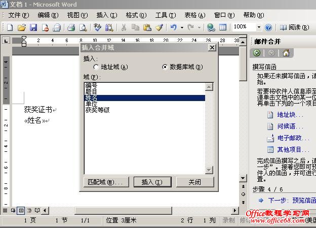 选择姓名,点插入,文中就出现了一个带符号的<<姓名>>,“获奖证书”这几个字是固定的,就直接打上去,继续插入<<题目>>、<<获奖等级>>和中间固定的串词:
