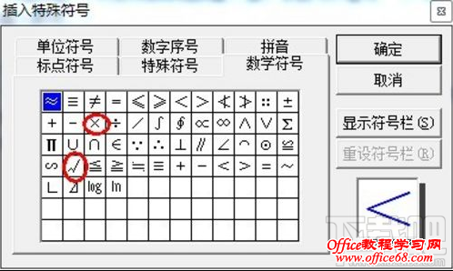 3、同样打开Word中“菜单栏”-->插入-->特殊符号,在弹出的“插入特殊符号”中单击“数字符号”,在下面你就可以找到想要的“钩钩”和“叉叉”了。