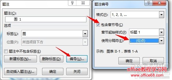 然后设置编号的样式,我这里用的是 1.1 这种格式,前面的 1 是章节编号,后面的 1 是图编号。如果你不想要章节编号,就把“包含章节编号”的复选框去掉。最后在设置一下两个数字之间的符合,我用的是句点。