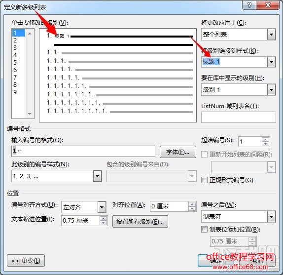 做上角的的多级列表是可以点击的,选择一级编号,然后在”将级别链接到样式“下拉框中选择”标题一“,如下图所示。