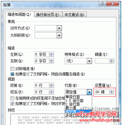 在弹出的对话框中找到间距那一栏的行距进行设置,在下拉选项中选择“固定值”,在“设置值”中输入数值,如20磅