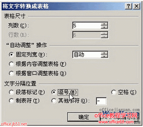 第3步:打开Word 2007“将文字转换成表格”对话框。在“列数”编辑框中将出现转换生成表格的列数,如果该列数为1(而实际应该是多列),则说明分隔符使用不正确(可能使用了中文逗号),需要返回上面的步骤修改分隔符。在“自动调整”操作区域可以选中“固定列宽”、“根据内容调整表格”或“根据窗口调整表格”单选框,用以设置转换生成的表格列宽。在“文字分隔位置”区域自动选中文本中使用的分隔符,如果不正确可以重新选择。设置完毕单击“确定”按钮,如图所示“将文字转换成表格”对话框。