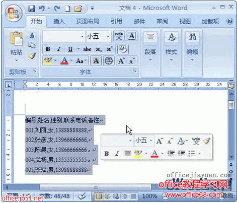 第1步:打开Word 2007文档,为准备转换成表格的文本添加段落标记和分割符(建议使用最常见的逗号分隔符,并且逗号必须是英文半角逗号),并选中需要转换成的表格的所有文字,如图所示为Word 2007文本添加分隔符。