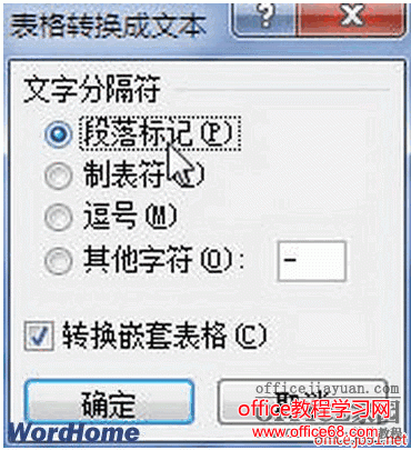 第2步:在打开的“表格转换成文本”对话框中,选中“段落标记”、“制表符”、“逗号”或“其他字符”单选框。选择任何一种标记符号都可以转换成文本,只是转换生成的排版方式或添加的标记符号有所不同。最常用的是“段落标记”和“制表符”两个选项。选中“转换嵌套表格”可以将嵌套表格中的内容同时转换为文本。设置完毕单击“确定”按钮即可,如图“表格转换成文本”对话框。