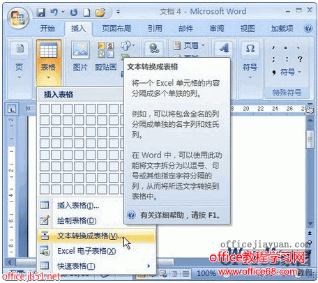 在Word 2007文档中将文字转换成表格