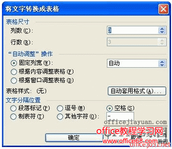 ④在“文本转换成表格”对话框设置适应的表格“列数”、“行数”、“列宽”、“分隔文字位置”等选项,确定即可。