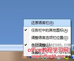 上图中的带有S的图标就是搜狗的图标。然后,我们右键该图标,选择“还原语言栏”