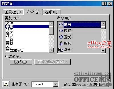 执行“工具”菜单中的“自定义”命令,选择“命令”标签,从“类别”列表中选择需要增加的命令所在的菜单,从“命令”列表中选择增加的命令,然后将命令拖放到菜单栏中合适的位置即可。如果需要删除某个菜单命令,只须保持“自定义”对话框的打开状态,选中菜单中需要删除的命令,按下鼠标左键将它拖离菜单即可。当然,我们还可以用更简便的方法:按下Ctrl+Alt+“-”组合键,这时鼠标光标将变成粗减号(按Esc键可以取消),在要删除的菜单命令上单击就可以将它删除。如图