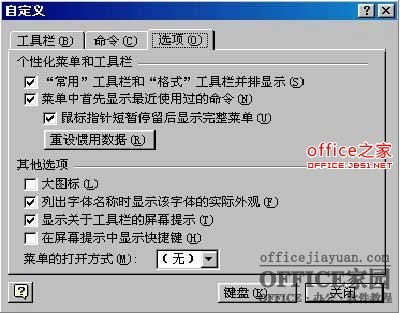 在默认情况下,Word只在菜单中显示最常用与最近使用过的命令。如果需要像从前Word 97那样一次显示全部命令,则需禁用个性化菜单。单击“工具”菜单中的“自定义”,然后单击“选项”选项卡,清除“菜单中首先显示最近使用过的命令”复选框,然后选择关闭就可以了。如图