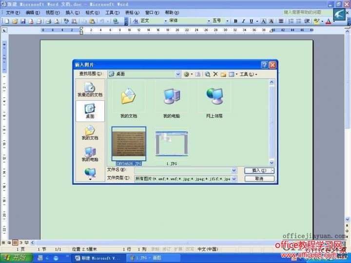 2.随便在电脑中哪儿新建一个word文档,进入后选择插入--图片--来自文件