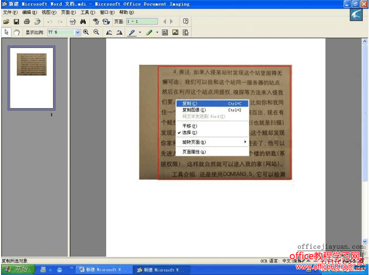 8.在Microsoft Office Document Imaging组件右边的窗口中直接用左键圈中你欲复制的文字,再点击右键选择复制。