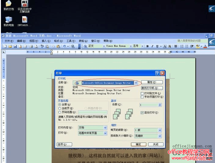 5. 依次点击文件--打印,打开打印窗口,只要你安装了Microsoft Office Document Imaging组件,完成我告诉你的第一步操作,这样在打印机名称下拉选项中肯定有一个名为Microsoft Office Document Imaging的打印机。