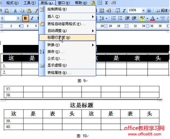 选中第一页的标题行和表头行。“菜单栏”→“表格”→点“标题行重复”。至此第二页开始都插入了标题行与表头。(如图9)