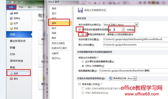4、确保右侧的保存选项中,“保存自动恢复信息时间间隔”与“如果我没有保存就关闭,请保留上次自动保留的版本”两项前的复选框被选中。(以Word 2010为例,默认自动保存时间间隔10分钟,图中修改为1分钟了,如下图所示:)