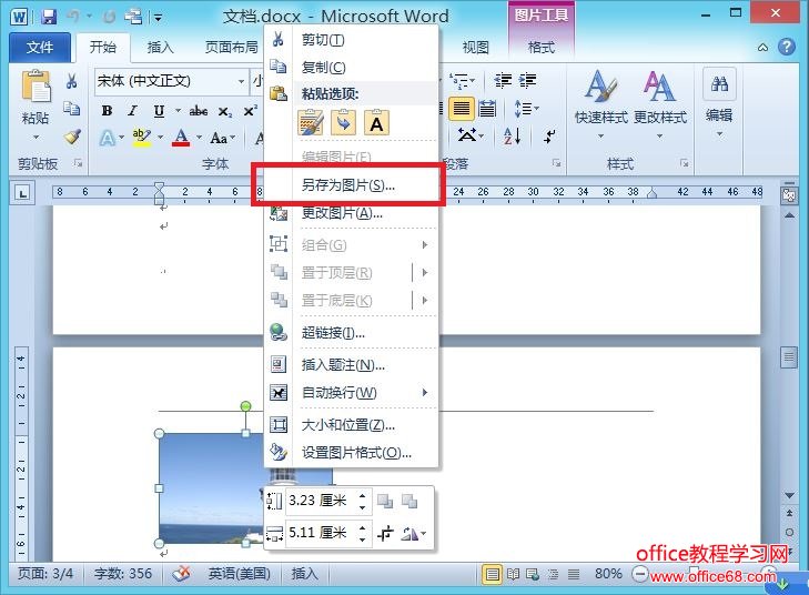 在早期的 Word 版本中,我们如果想要将插入到文档中的图片单独提取出来,通常的方法是将文档另存为网页格式,然后在与网页对应的文件夹中可以找到文档中的所有图片。虽然图片提取出来了,但是基本上也很难再次使用了,因为提取出的图片清晰度不够,比较模糊。然而,在 Word 2010 中提供了一个非常实用的功能,可以直接在文档中提取任意一张图片。 1、打开包含想要提取图片的文档,右击文档中想要提取的图片,在弹出菜单中选择“另存为图片”命令,如图:
