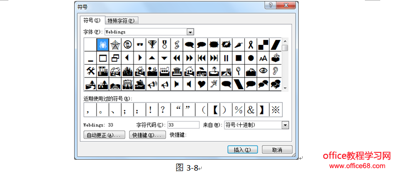 这里会显示一些常用的符号和我们最近使用过的符号。单击“其他符号…”,打开“符号”对话框,如下图: