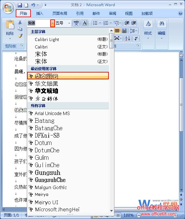 2 在“开始”选项卡中“字体”的选项组,单击“字体”的下拉按钮,选择所需要的字体形式,例如“华文彩云”;