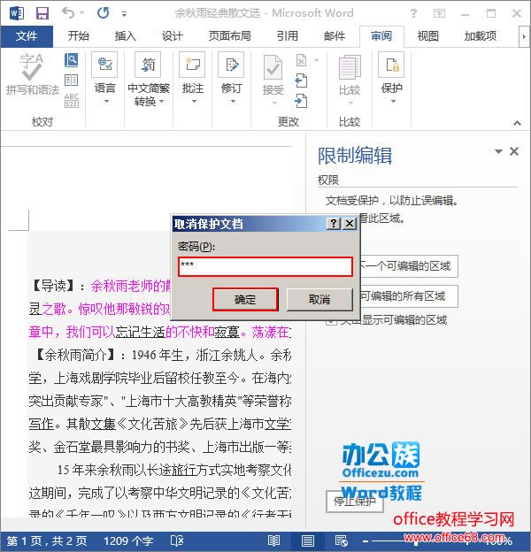 3 此时会弹出“取消保护文档”的对话框,我们在“密码”文本框中输入之前保护文档时设置的密码,并单击“确定”按钮。