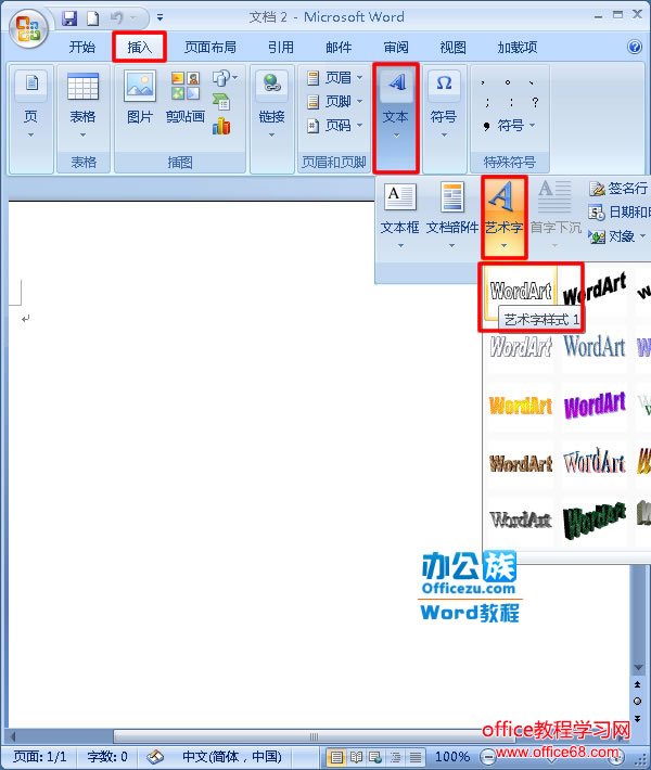 艺术字结合了文本和图形的特点,能使文本具有图形的某些属性,所以能像图形一样设置各种各样的艺术效果。因此,在编辑排版的过程中,往往需要运用艺术字来实现某种特殊效果,使读者得到更丰富的视觉感受。由于艺术字样式有限,我们可以再运用word里的功能给艺术字添加阴影效果,使艺术字更立体,在用户视觉上更加多样化。 操作步骤 1 切换到【插入】选项卡,选择【文本】—【艺术字】,单击选择【艺术字样式1】。